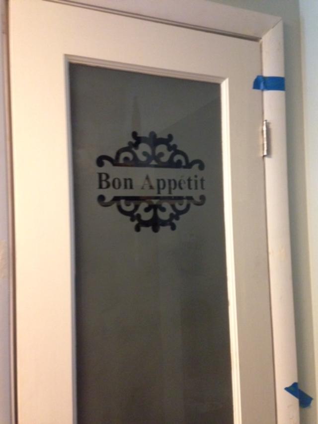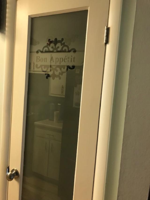This is where you will have to use your imagination. I was so excited when she brought me the design, that I took no pictures. It is a good idea to look at a few tutorials before actually attaching the design to the inside of the door. Just a quick note, the image is reversed. Before you actually attach it to the inside of the door, measure, measure and measure again. You want it to be level and centered. Take your time to make it perfect. This is what will make it look like a real etched door.