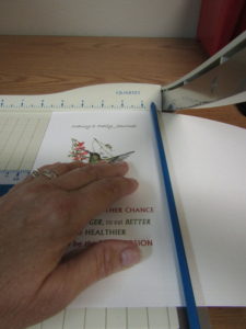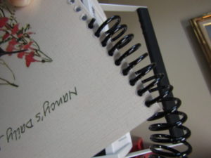 Design a cover that has a positive message. Using Word is a good way to design the cover. I added a positive message and a picture of a humming bird, which is my mother’s favorite. Print the cover on card stock. There are all kinds of colors and textures to choose from. Of course, you will design yours to your loved one’s taste. It is nice to have a little inspiration since they will be looking at it every day!