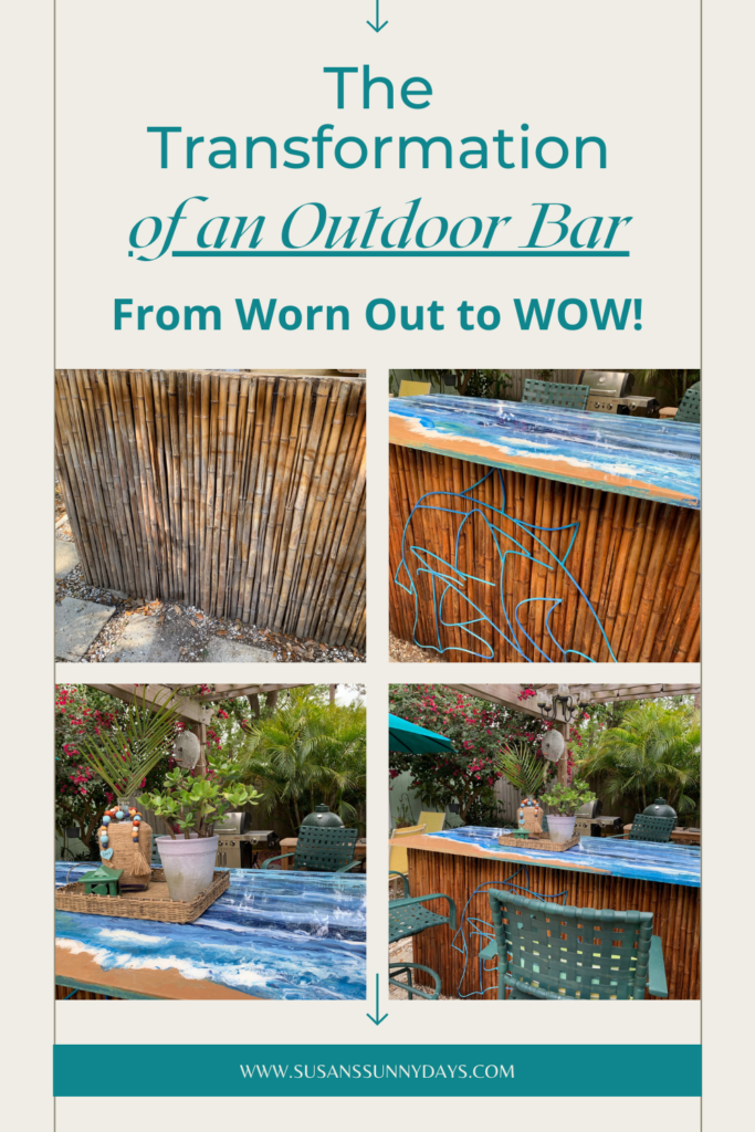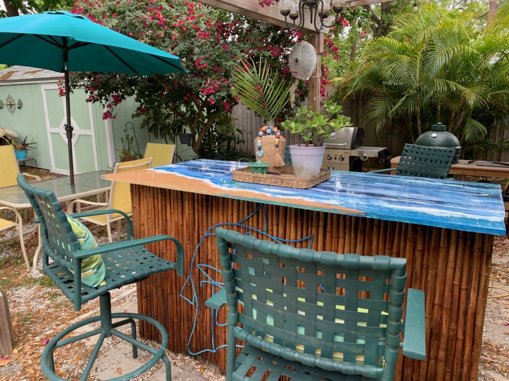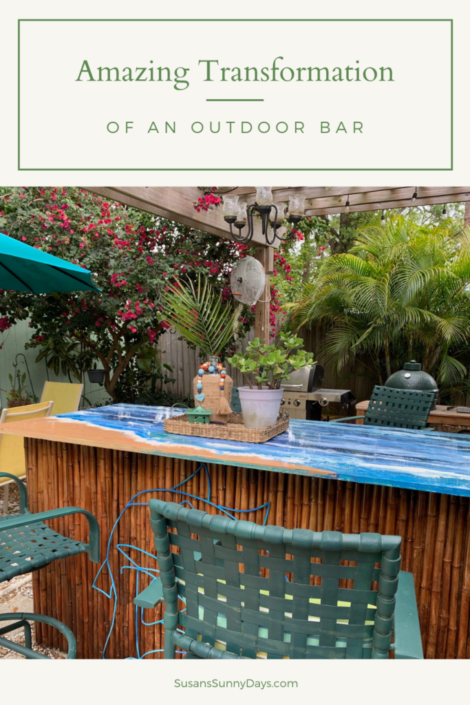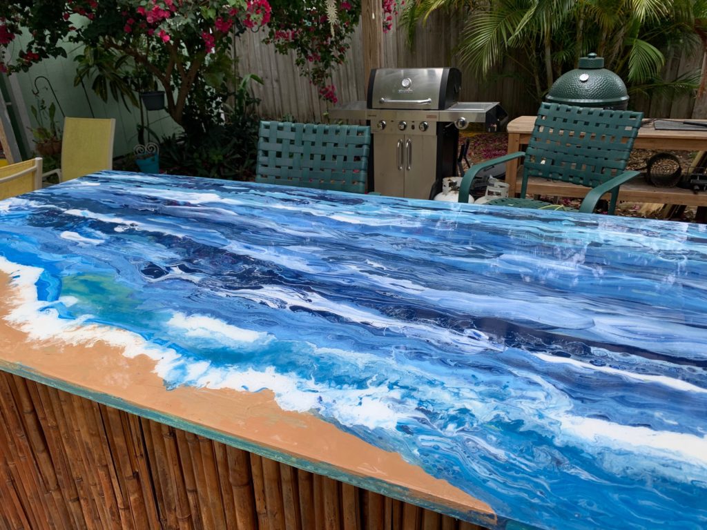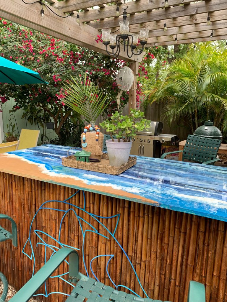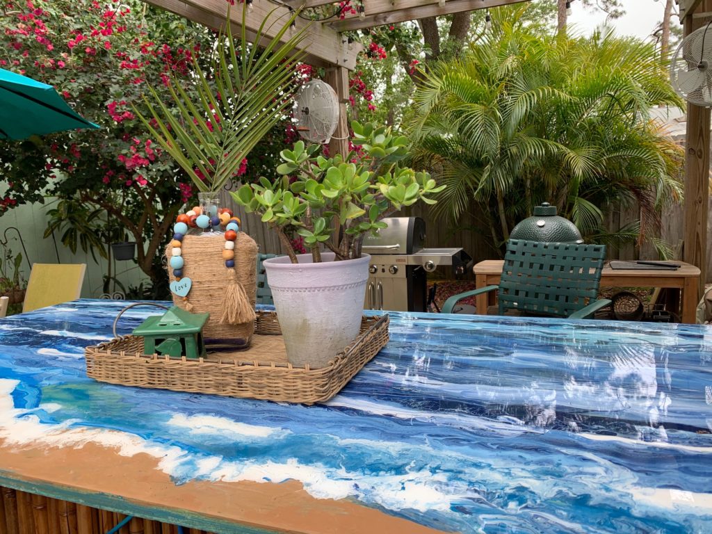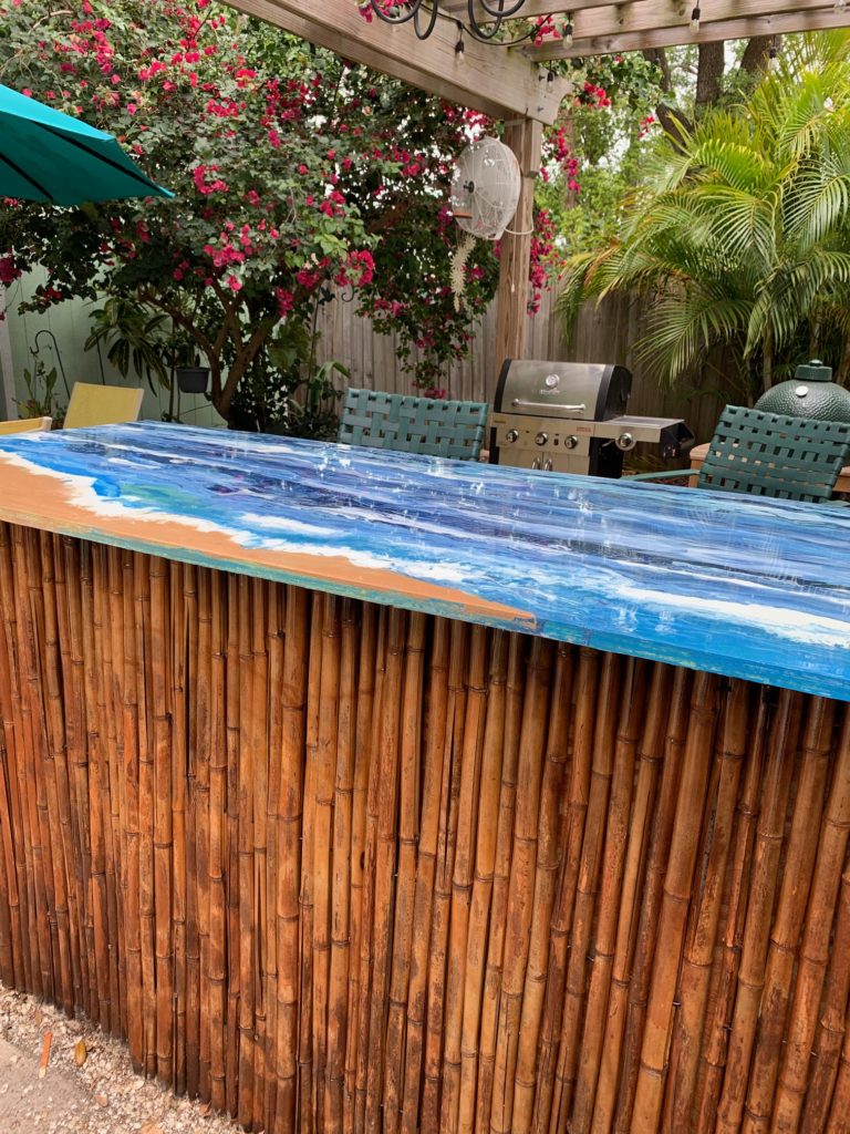 Reading the last 2 posts, you know this is the final edition to a project that has been weeks in the making. We are ready for the big reveal. Part one, DIY Amazing Tiki Bar Counter Top, is about how I painted the beach scene on the board using acrylic paints and a fluid art technique. Please check it out. The second post, DIY Resin Tiki Bar Counter, Tips from a Beginner, gives some tips on doing a resin sealer. This might be the inspiration for you to try it out. This was the first time I had ever used resin and I shared some of what I learned. Hopefully, I made it less intimidating.