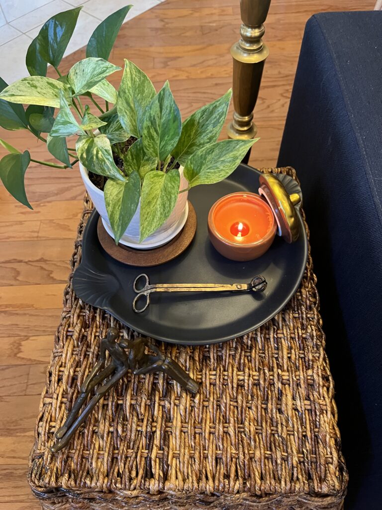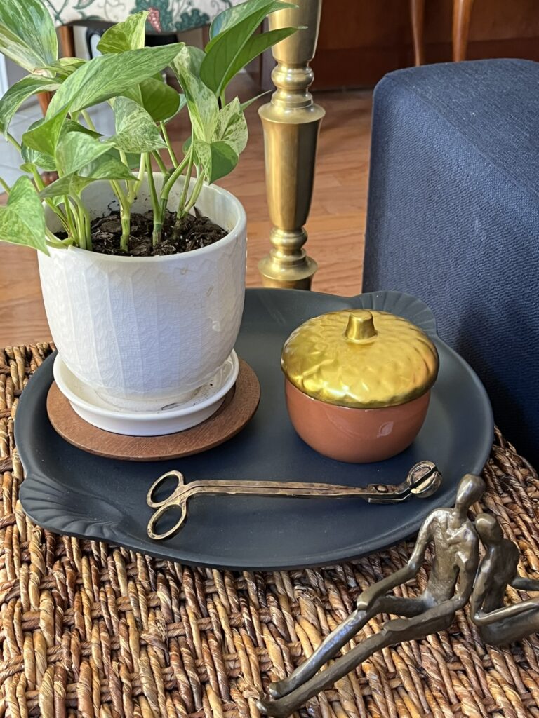 The tray was a thrift store find too. It was silver and I sprayed it with 2 coats of matte black and 3 coats of clear matte. I purchased the wick cutter from Amazon. It was on sale but only came in black or silver. I got the black and added some Rub and Buff. The acorn is actually a candle I made. If you are interested in learning about it you can find it in this previous post. The beautiful sculpture was from my wonderful sister, Janet. I have no idea where she found it but, I love it.