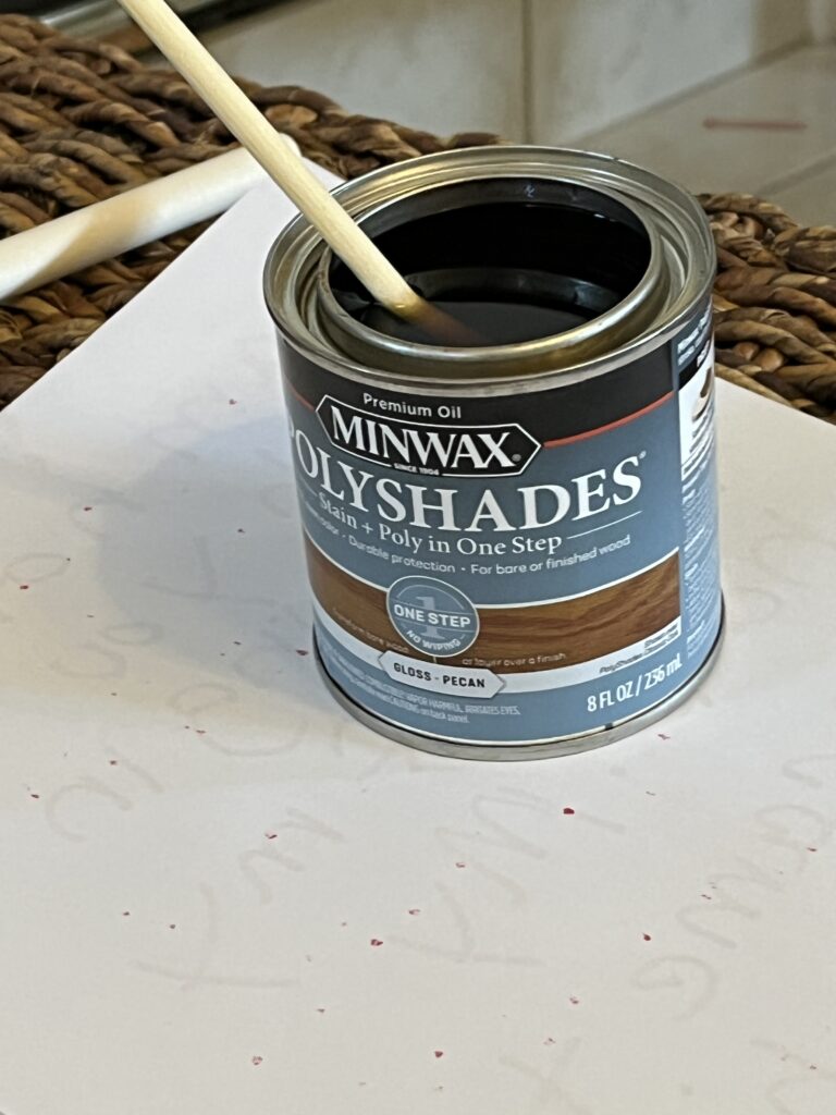 Years ago I touched up a beautiful stained wicker set with a polyshade and it came out great. I thought this trunk would be a perfect candidate for the same application so I picked it up at Home Depot. Even with generously dabbing the product so I had good coverage, I still had half a can left.Â