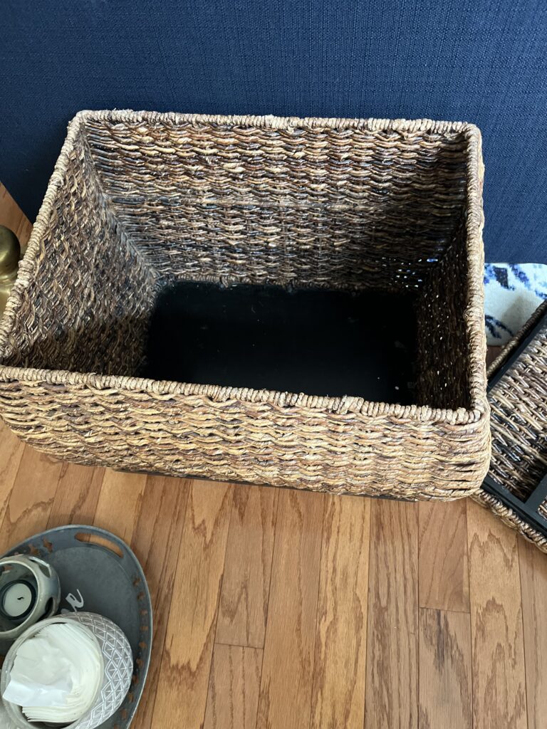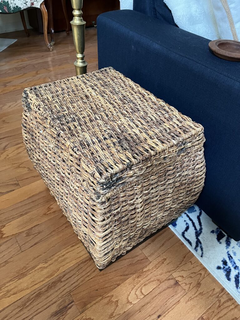 On to the next store! We went to another Goodwill where I saw a beautiful woven basket/trunk with a lid. I couldn’t find a price so I just walked away. Honestly, it was filthy, full of spider webs and it looked like someone had spray painted something on top. It was still a beautiful shape and had such potential. Brianna insisted I ask about it and I’m so glad I did. I got it for $35.00 which I thought was a great deal.